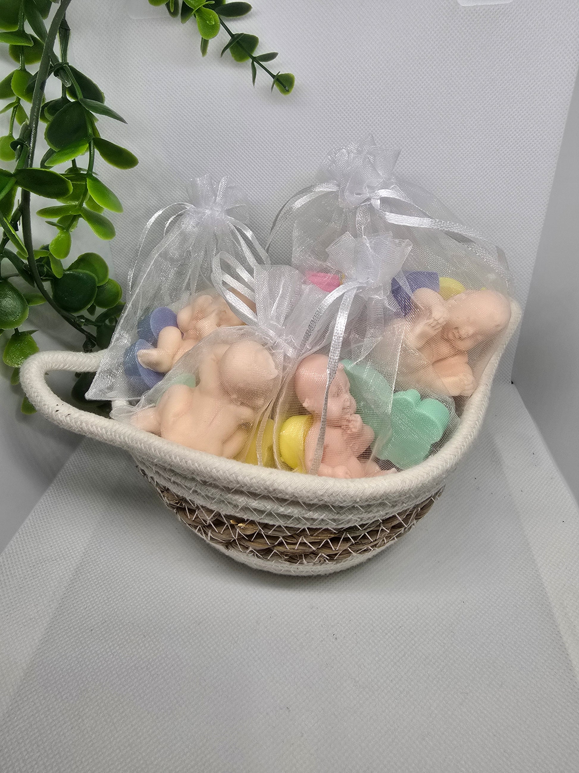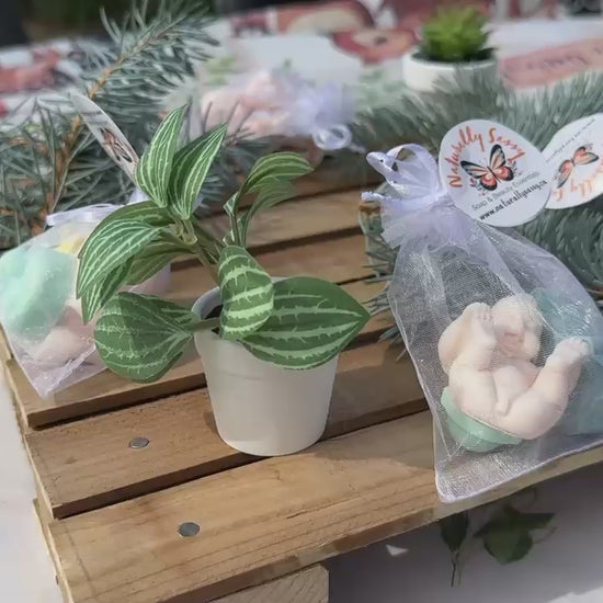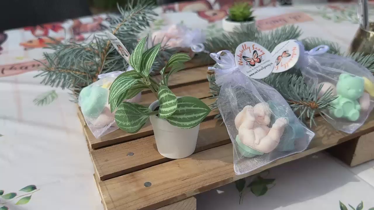 This Baby Shower Pack includes gentle and soothing baby soaps, made with Lavender oil, Mancurian Dragon scent, floral and tart sweet. Perfect for baby shower giveaways, each pack has one baby and 2 mini soaps each and comes in a gift bag. Take advantage of our bundle deals and treat your guests to a relaxing and aromatic experience.