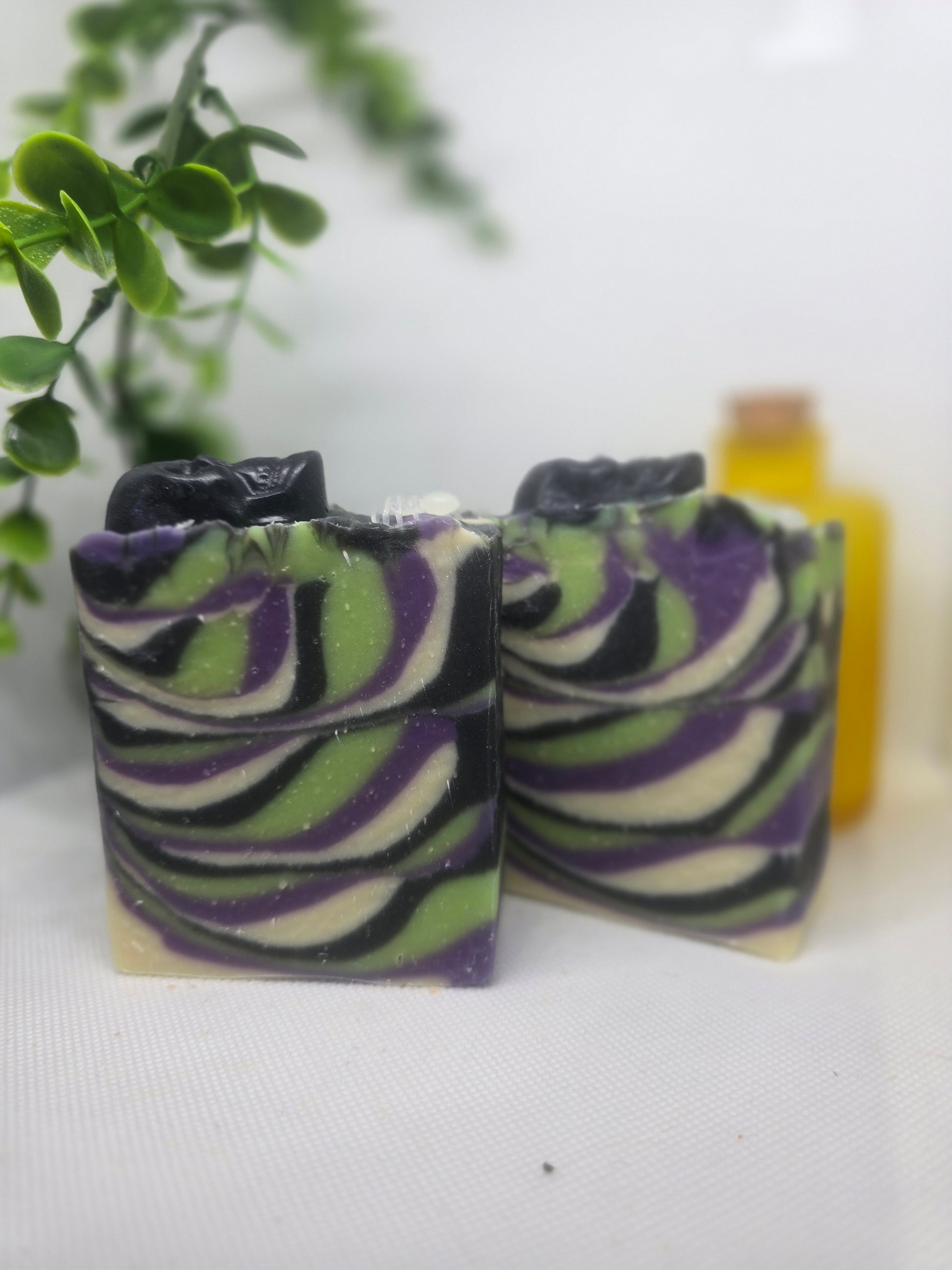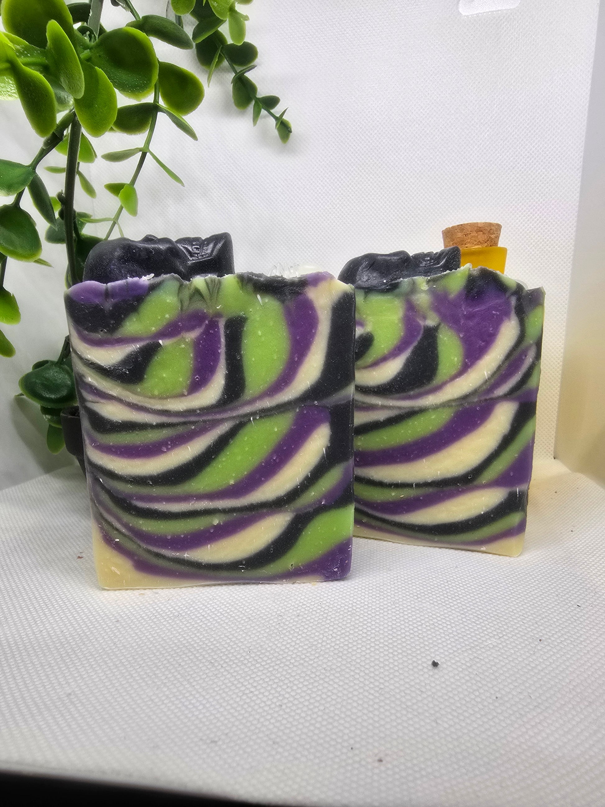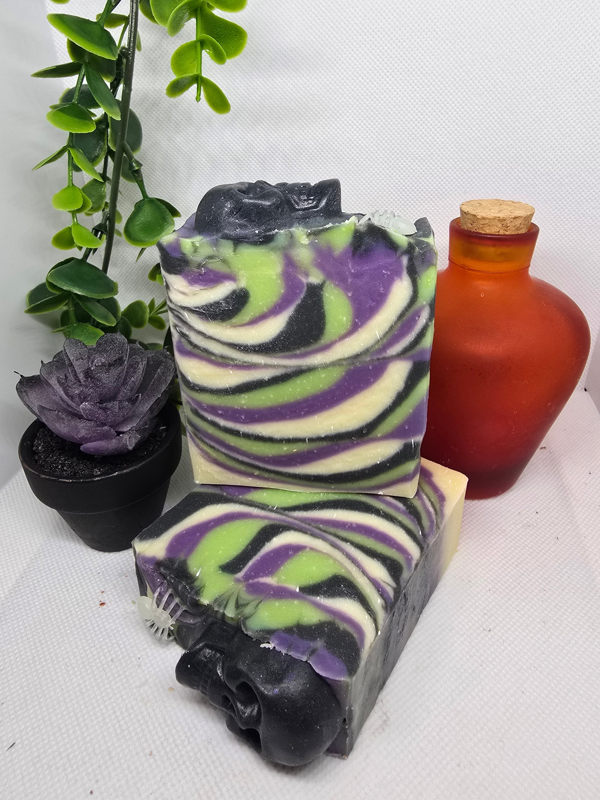 Experience the daring adventure with Spiders & Skull Layers! Made with Castor, coconut, and olive oils along with Tallow, this soap lathers naturally. Scented in Manchurian Dragon, its intricate wave design features glow in the dark spiders (remove before use). Take a risk and indulge in this bold, homemade soap. Cold Processed.